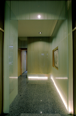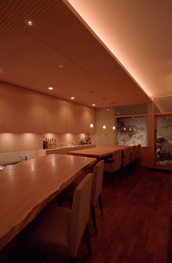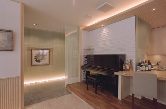 中に入るまで”フランス”を感じさせないしつらえ。 竹塀の露地と和の外観から、 引戸をくぐるとガラスのエントランスホール。 向きを変えると一転、フォーマルなスペースをつくりあげました。 料理も絶品です。是非一度おこしくださいませ。